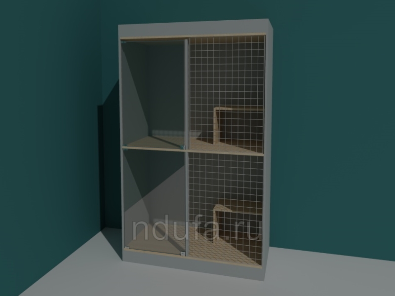Гостиничный номер для кошки. Размер 2000х850х1800мм. Материал каркаса - ламинированная пластиком ДСП 16мм. Полки из ЛДСП. Стекло 4мм. Каркас дверки алюминиевый профиль, заполнение металлическая сетка с полимерным покрытием. Крышка металлическая сетка. Сечение ячейки 50х50мм