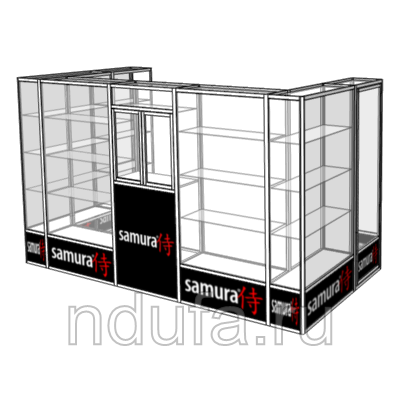 Профильный киоск для продажи ножей. Высота 200см, ширина 350см, глубина 165см. 7 секций. Входная дверь в киоск справа.